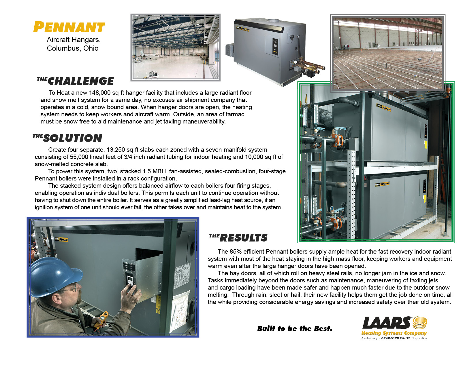 To Heat a new 148,000 sq-ft hanger facility that includes a large radiant floor and snow melt system for a same day, no excuses air shipment company that operates in a cold, snow bound area. When hanger doors are ope, the heating system needs to keep workers and aircraft warm. Outside, an area of tarmac must be snow free to aid maintenance and jet taxing maneuverability.