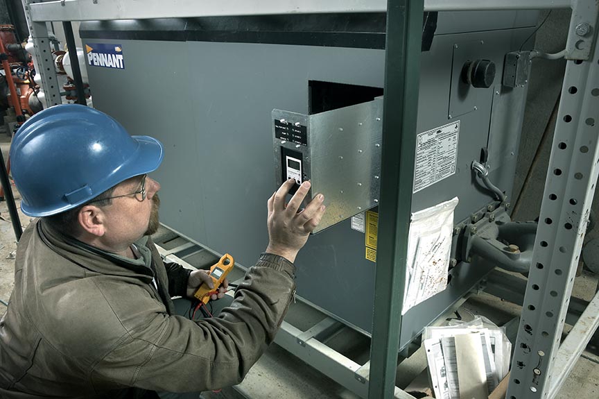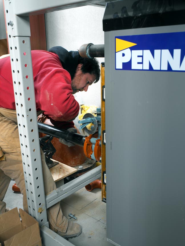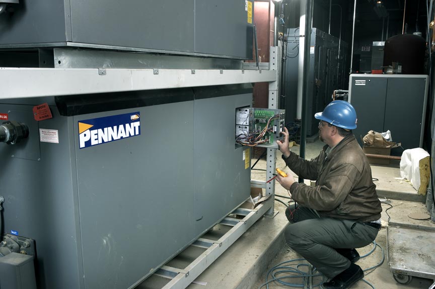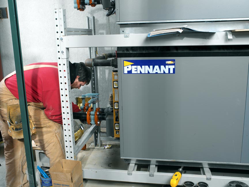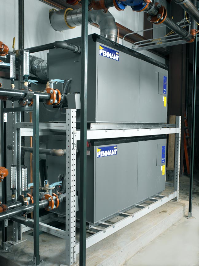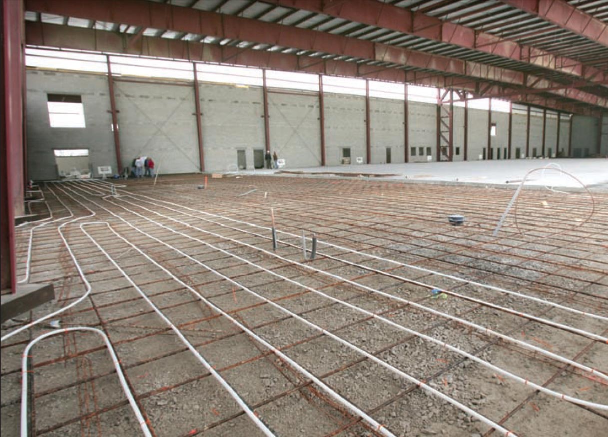 This project is a new installation of a huge 'in-floor' radiant heat system. Four separate, 13,250 sq-ft slabs each zoned with a seven-manifold system consisting of 55,000 lineal feet of 3/4 inch radiant tubing for indoor heating and 10,000 sq-ft of snow-melted concrete slab were created. To power this system, two, stacked 1,500 MBH, fan-assisted, sealed-combustion, four-stage Pennant boilers were installed in a rack configuration.