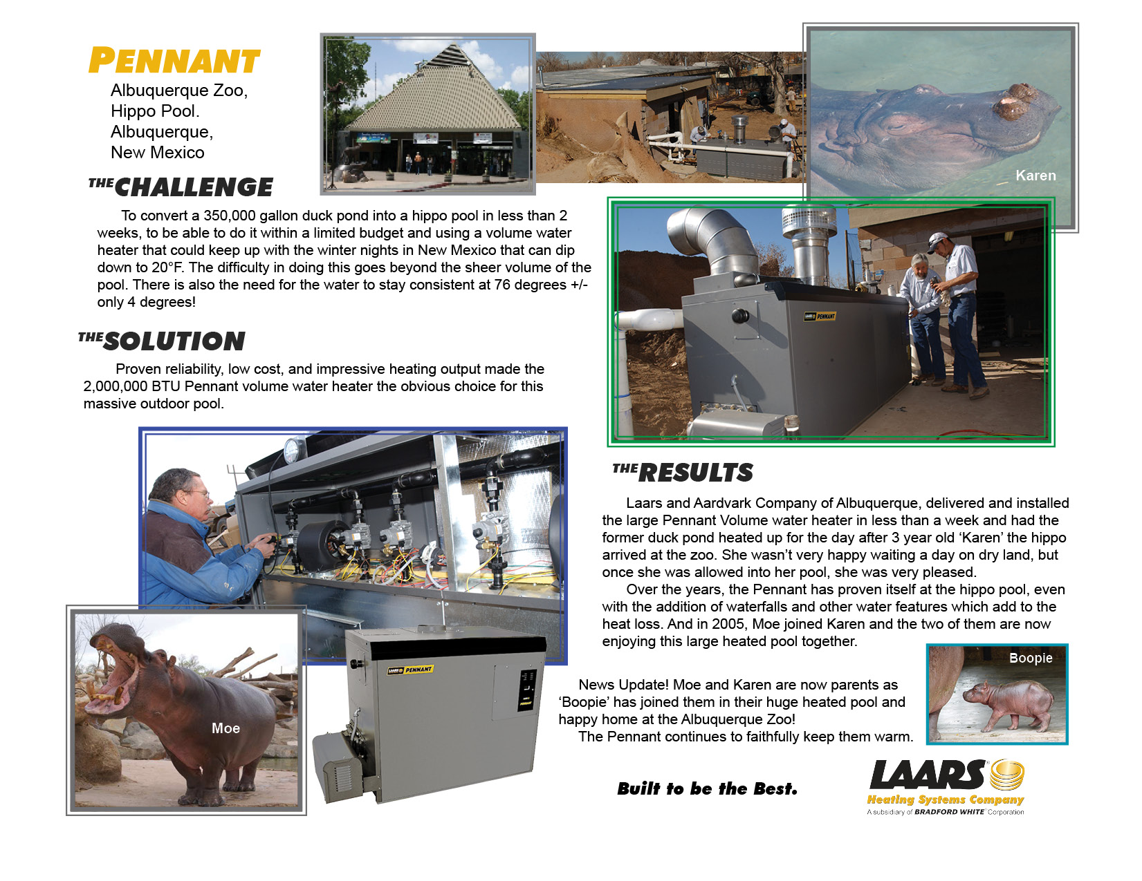 To meet the task of keeping the hippos at their favorite temperature, a 2000 MBH Laars Pennant Pool heater was selected. The project itself was done during an overhaul of the facility and the installation had to happen within a workweek. To everyone's delight, the Pennant boilers arrived on schedule and the installation was described as perfectly smooth.