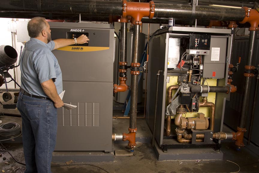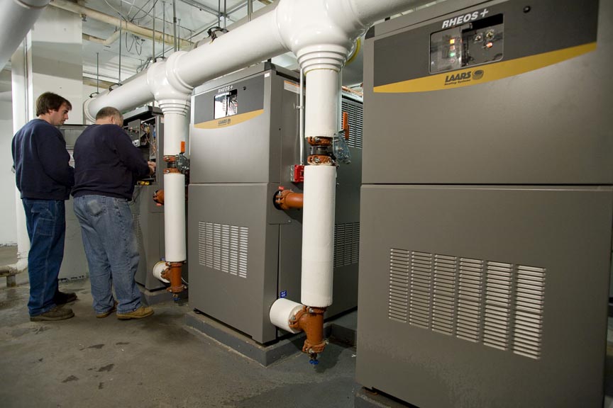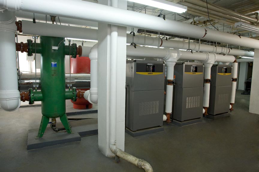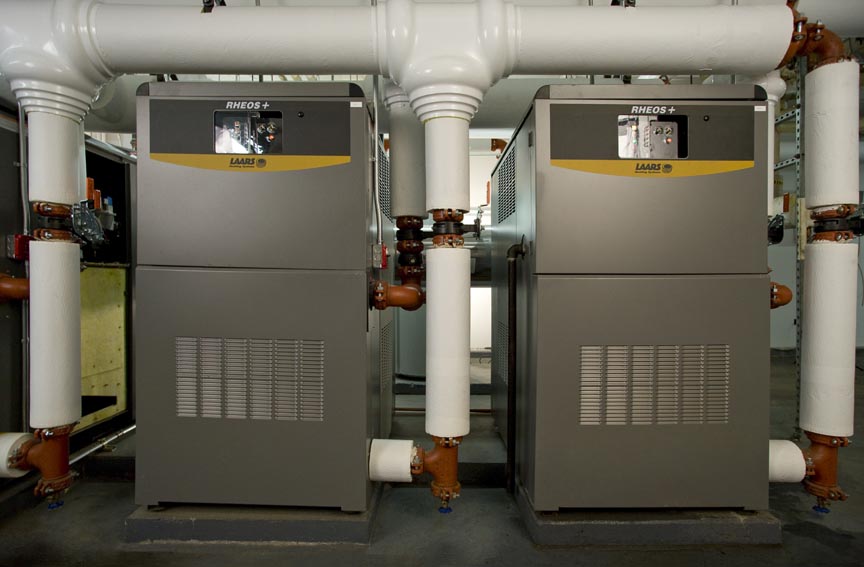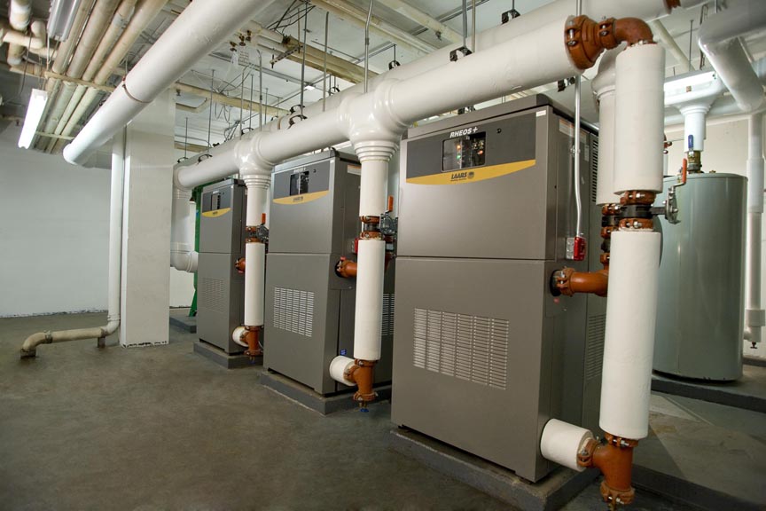 Eighteen highly efficient, condensing Rheos+ boilers, ranging in size from 1,200 to 2,400 MBH, replaced the twenty-two independently controlled 70% efficient boilers. To maximize the efficiency of the Rheos+ systems even further, a building automation system was installed to feed each boiler a variable firing rate signal as needed for both heating and domestic hot water. The end result was a beautiful install, an environmentally efficient system and happy owners and tenants!