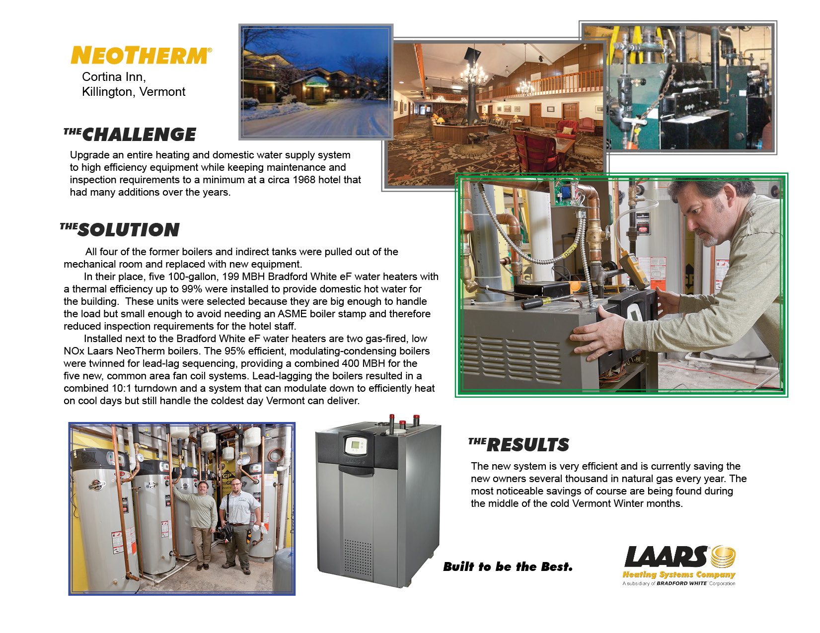 Reliability and high efficiency were the main goals of the heating system replacement and that is why two 95% efficient Laars NeoTherm boilers and Five Bradford White eF ultra efficient water heaters were selected. They are easily doing the job and at an operational cost that is far less than was forecasted given the consumption rates of the previous boilers. Now the hotel is once again keeping travelers warm and cozy thanks to Laars and Bradford White heaters!