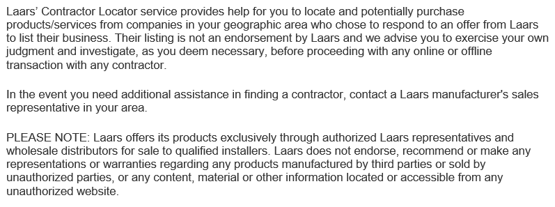 All contractors presented in the Laars Contractor Locator are independant contractors and not employees of Laars Heating Systems.